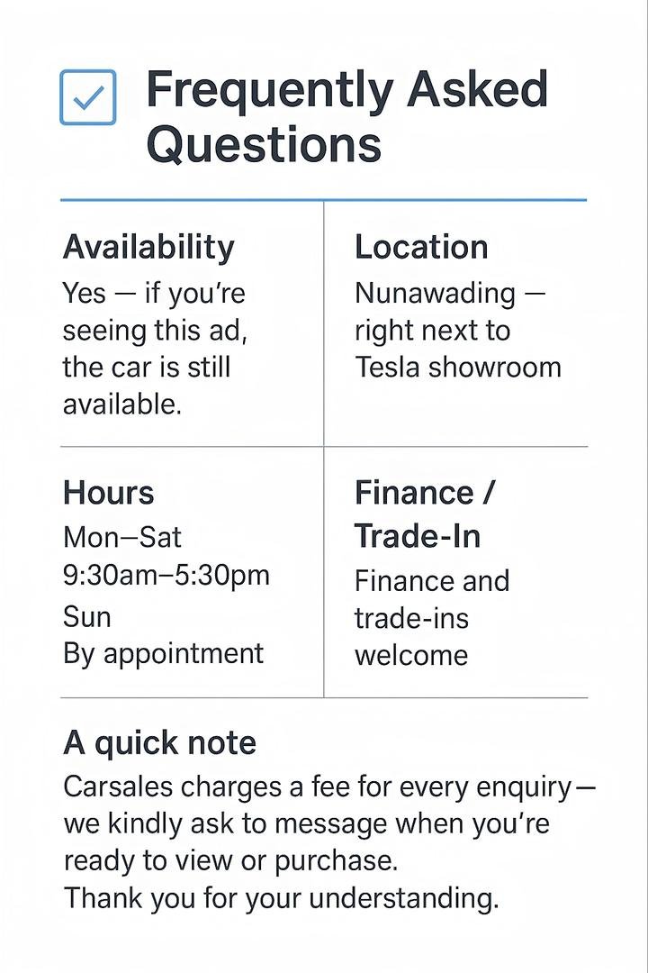 We are a family-owned business with over 90 cars in stock. All our cars are owned outright and not financed. We specialize in European and exotic motor vehicles, and all our vehicles come with a Victorian roadworthy certificate. All our prices are drive away and include Victorian stamp duties and transfer fees. We provide a minimum of 3 months registration or the remaining balance of theregistration. All our vehicles are PPSR checked and come with a Guarantee clear title. Competitive finance available plus we provide 1-5 year warranty options. We can transport vehicles to you interstate at a cost. All trade ins welcome . Genuine enquries only. if you are just browsing and dont want to purchase please dont send through an enquiry .